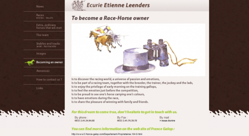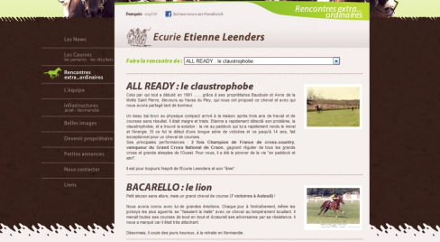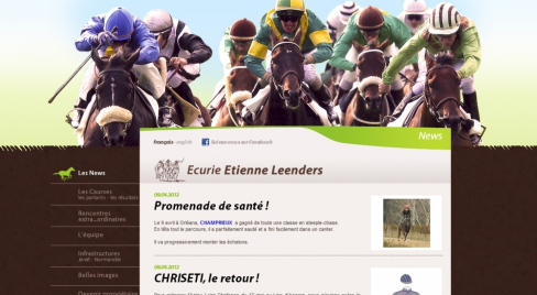 Etienne et Christine Leenders sont biens connus dans le petit monde du cheval pour l'excellence de leur entraînement. Avec plus de 2000 victoires en galop et 30 ans d'activité, l'entreprise Leenders communique très régulièrement sur son site à propos de ses résultats de course, de son actualité, de ses rencontres avec des chevaux extraordinaires. Le tout en français et anglais.